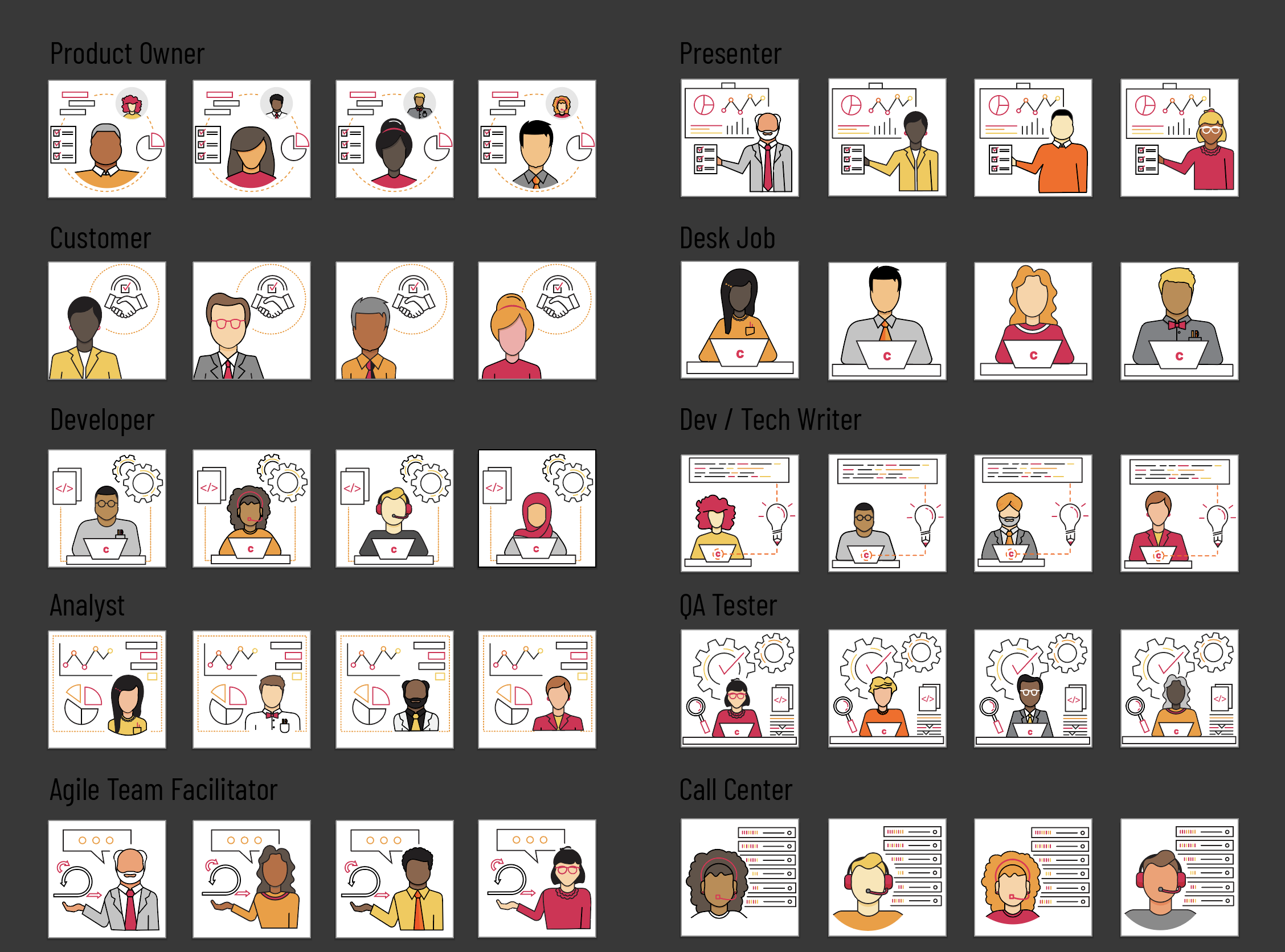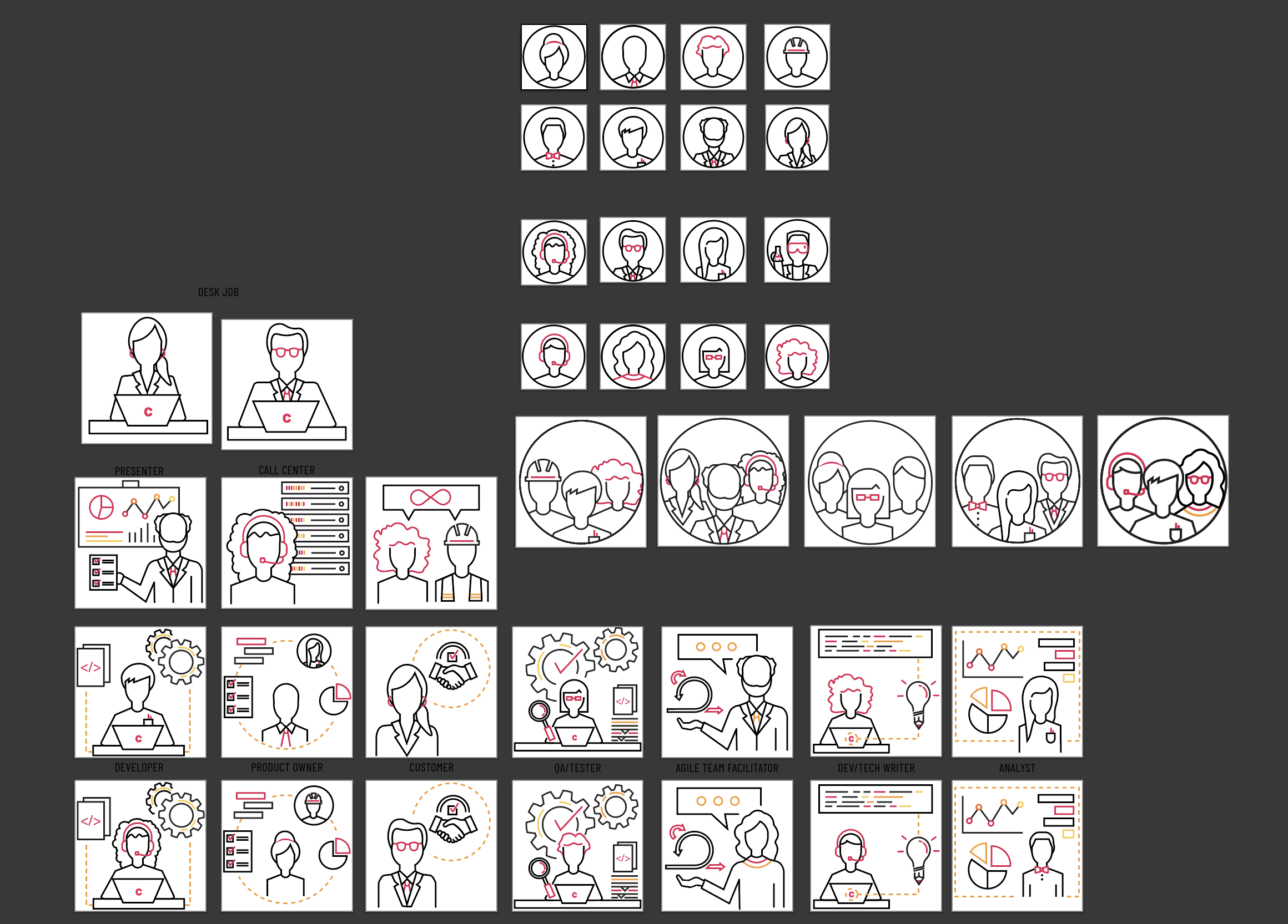 After using this set for a year or so, members of Cprime requested icons that clearly represented diversity, and while the current icons were only outlined strokes, our team needed to strategize how to best represent different races, gender identities, religious backgrounds, body sizes, age, and abilities. As a result, the following icons were developed.