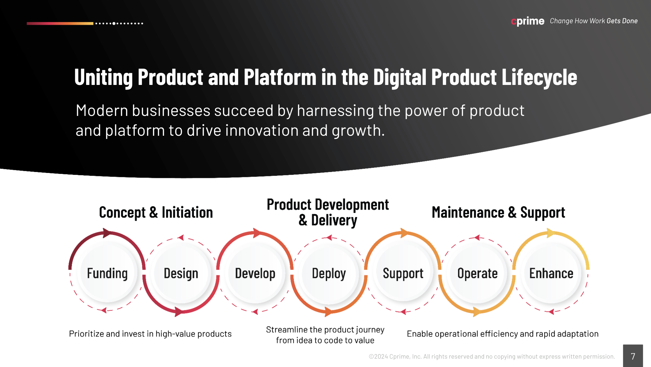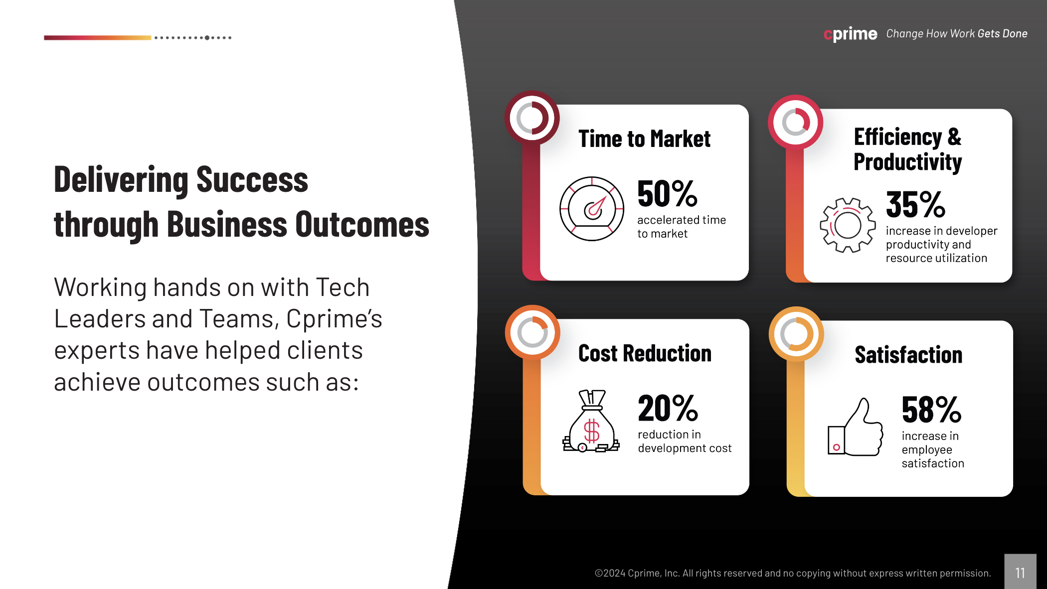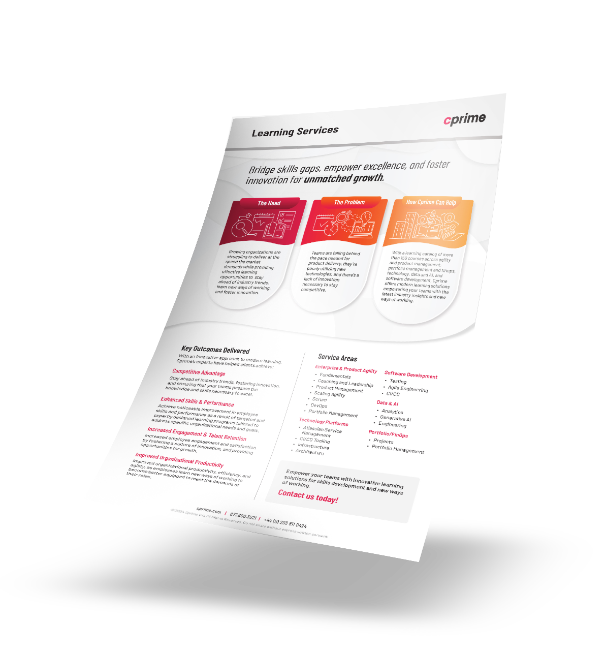 As a trusted global consulting partner backed by Goldman Sachs and Everstone Capital, Cprime empowers organizations not only to accelerate change but to embrace it as a catalyst for strategic growth. Going beyond traditional consulting and guidance, we help modern businesses accelerate change and exceed customer expectations through intersecting product and platform.